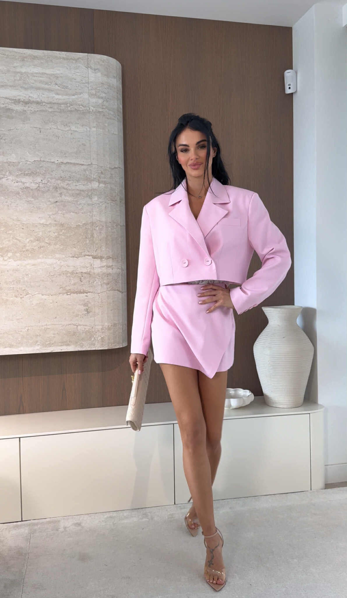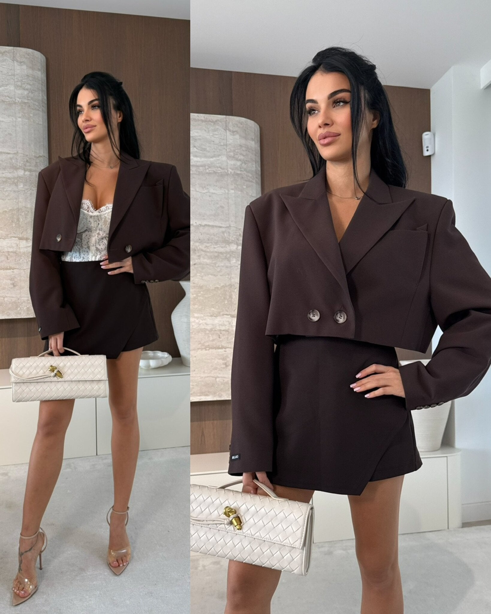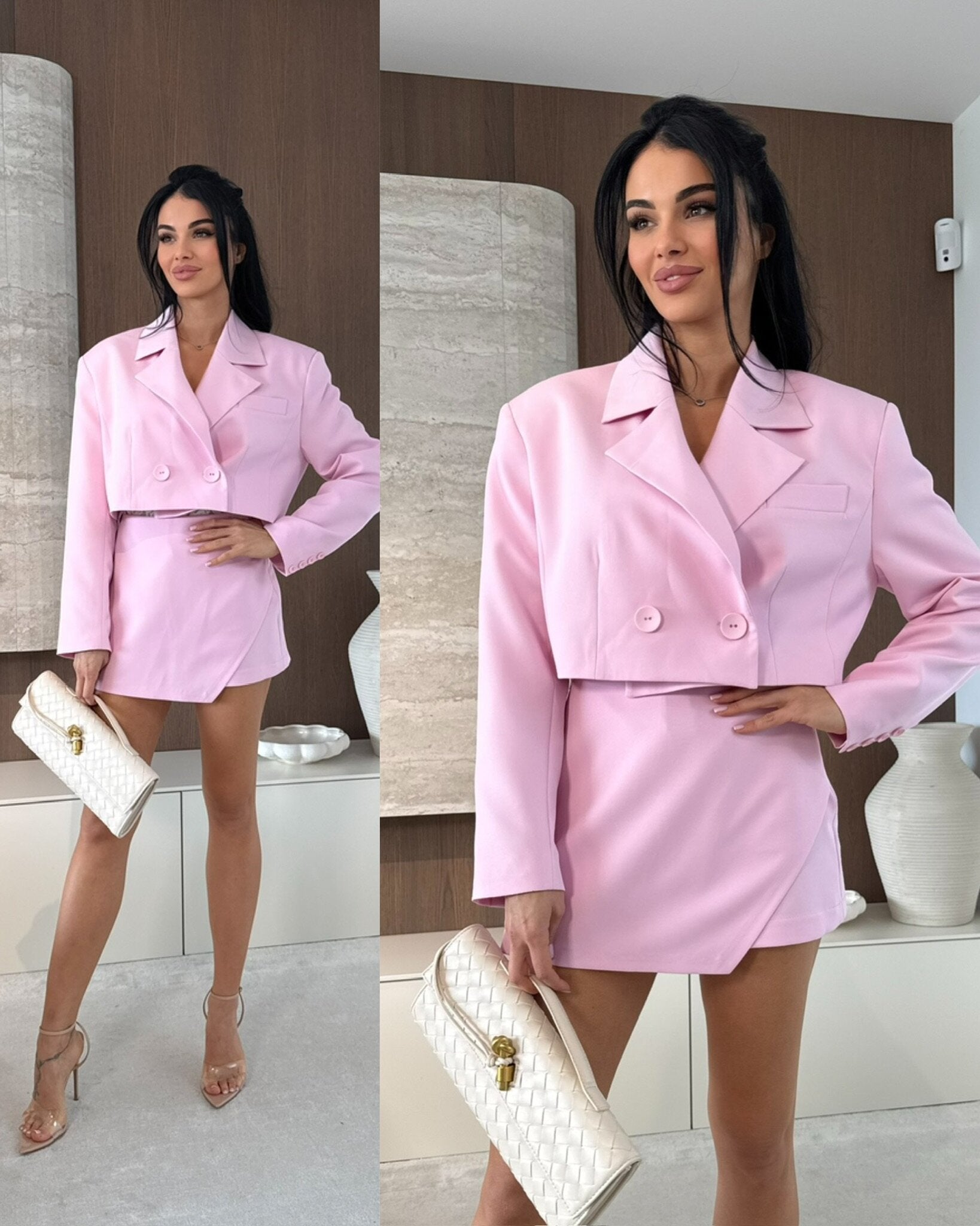 The Shelia Set includes a skort and a cropped blazer, designed for versatility and style. The skort offers the comfort of shorts with the polished look of a skirt, while the cropped blazer enhances this ensemble, providing a structured silhouette. This combination is ideal for both professional settings and casual outings.